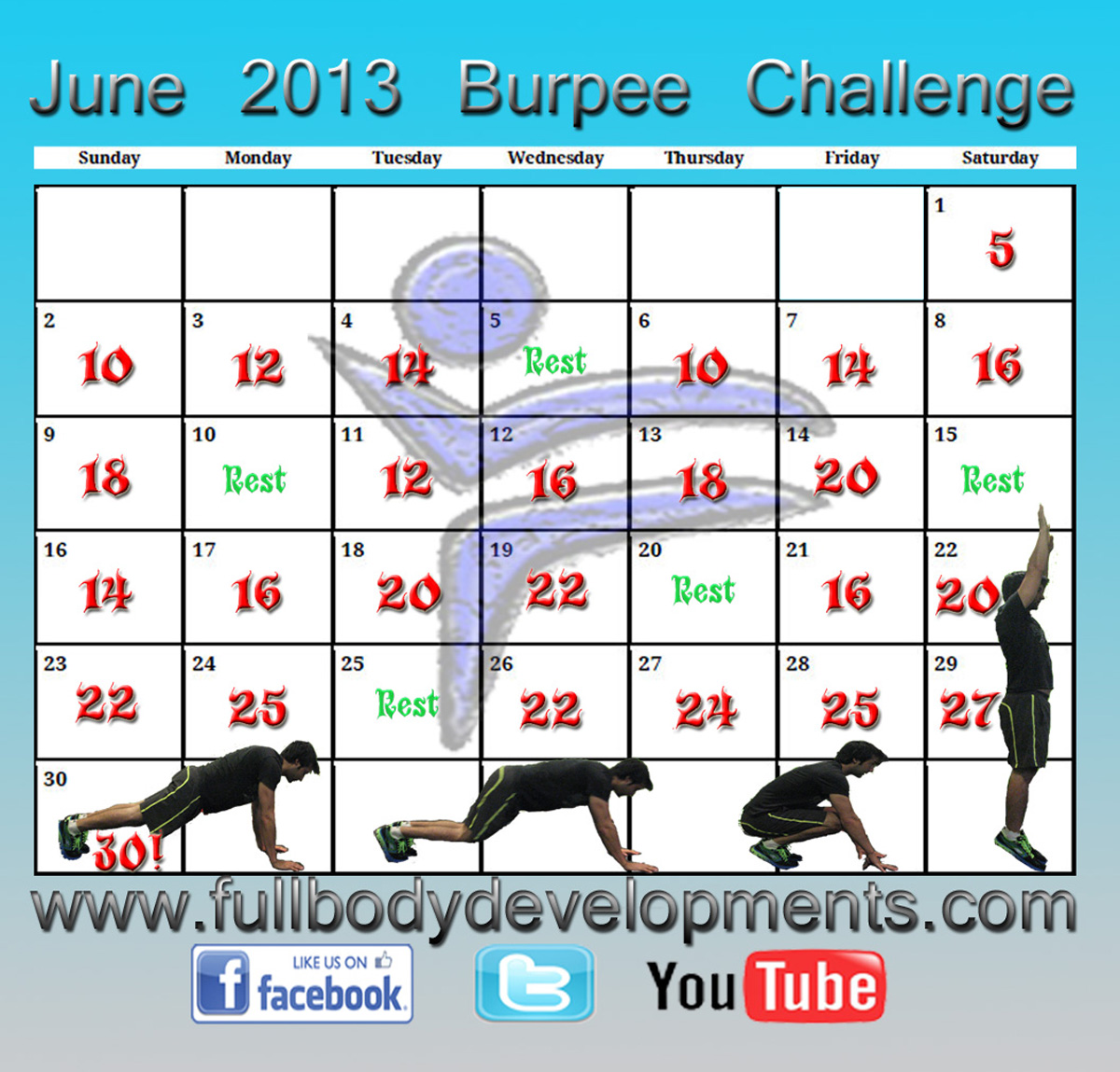 Today is the day! You have all probably heard of the squat challenge and sit up challenge etc, so FBD is spicing it up with our own month long challenge. June is our BURPEE Challenge. Follow the calendars daily total of burpees, and by the end you will have done 448 total!!!