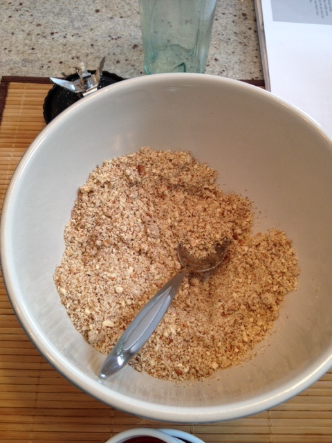 1. To make the pecan and almond meal, process the nuts in a blender.Â