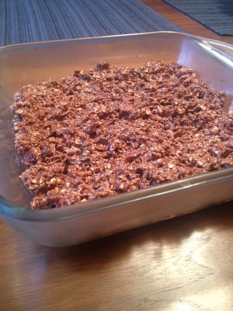3. Place into a pam sprayed 8×8 pan. Press flat. Refrigerate for 20-30 minutes before cutting into 10-12 pieces. Store in fridge.
